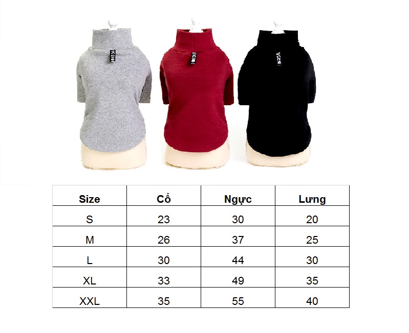Lưu ý: Số liệu trên chỉ mang tính chất tương đối. Size áo còn phụ thuộc vào giống cún và độ dày lông. Để chọn chính xác cỡ áo cho chó mèo, bạn vui lòng chat trực tiếp cho shop để được tư vấn tốt nhất. Xin cảm ơn!