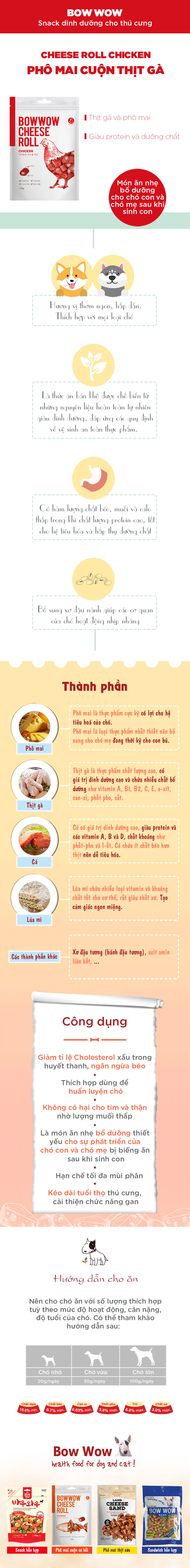 Phô mai cuộn thịt gà Bowwow có thành phần chính là thịt gà và phô mai, giàu protein và dưỡng chất. Đây là món ăn nhẹ bổ dưỡng cho cả chó và mèo, nhất là chó con và chó mẹ sau khi sinh con. Hương vị thơm ngon, hấp dẫn, chứa lượng chất béo và muối thấp.