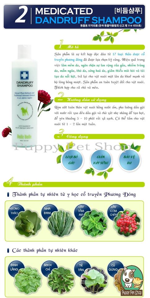 Dầu gội trị gàu cho chó Budle’Budle Dandruff Shampoo thuộc dòng sản phẩm dầu gội đặc trị các bệnh về da cho chó. 17 loại thảo dược phương Đông được lựa chọn kỹ càng và bào chế nên Budle’Budle Dandruff Shampoo, giúp dưỡng ẩm cho làn da khô bong tróc của thú cưng, làm dịu ngứa, lành vết thương, bảo vệ thú cưng nhà bạn khỏi kích ứng và rụng lông quá mức do thời tiết, vi khuẩn…