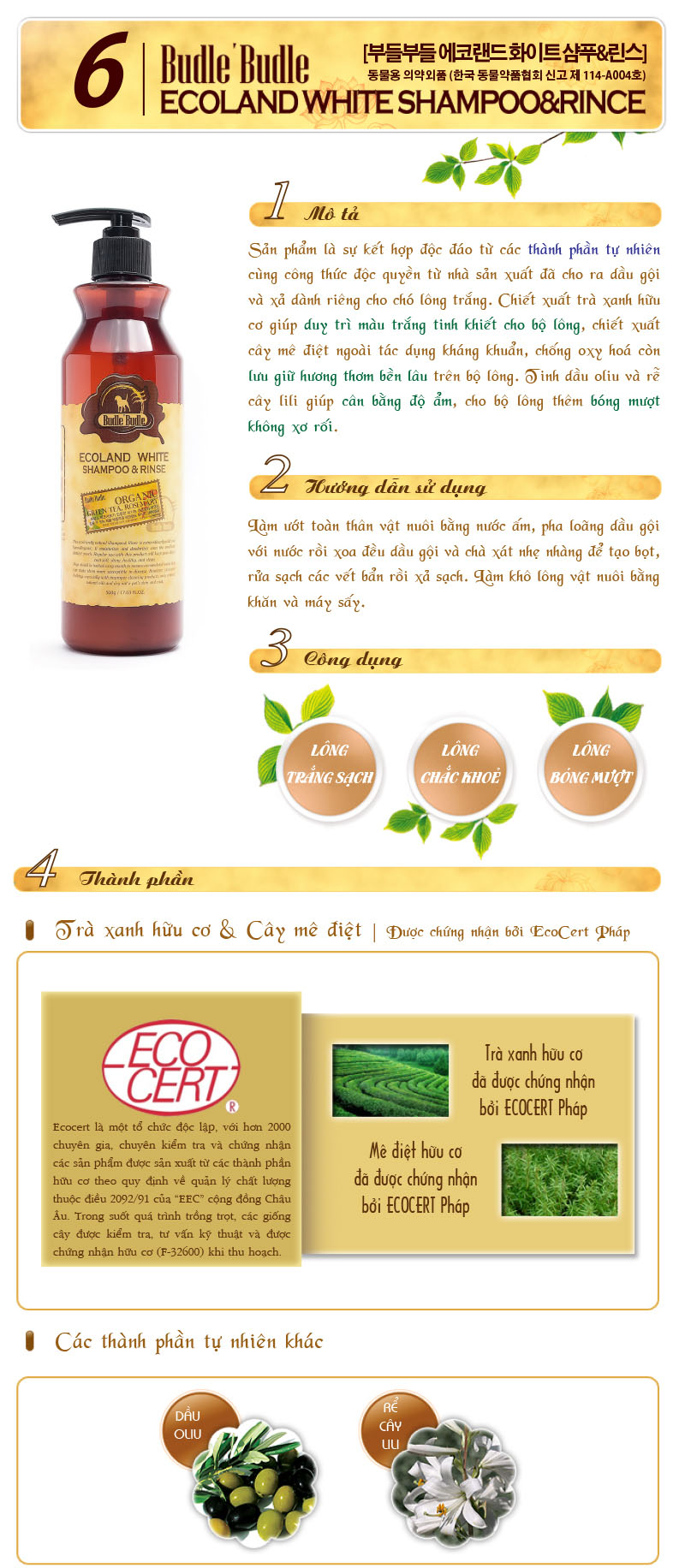 Dầu gội và xả chó lông trắng Budle’Budle thuộc dòng sản phẩm chăm sóc da và lông chó. Dầu gội Budle'Budle White shampoo & rinse được tạo nên từ các tinh chất thảo mộc hữu cơ tự nhiên, có tác dụng chống oxy hóa, giữ cho bộ lông của các chú chó trắng luôn tỏa sáng, không bị lấm bẩn.