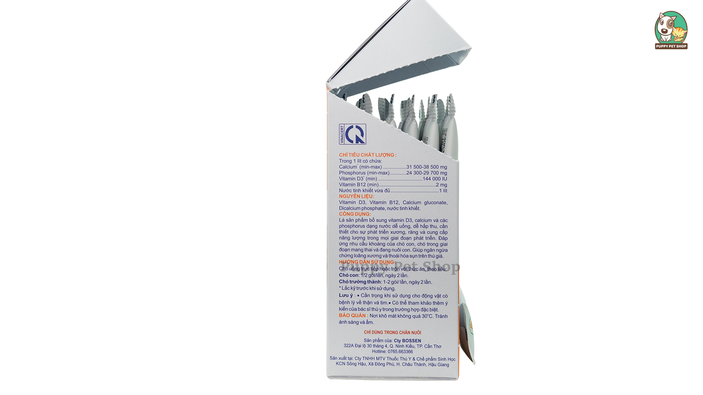 Là sản phẩm bổ sung vitamin D3, Calcium và các Phosphorus dạng nước dễ uống, dễ hấp thu, cần thiết cho sự phát triển xương, răng và cung cấp năng lượng trong mọi giai đoạn phát triển. Đáp ứng nhu cầu khoáng của cún con và cún trong giai đoạn mang thai và đang nuôi con. Giúp ngăn ngừa chứng loãng xương và thoái hóa sụn trên cún già.