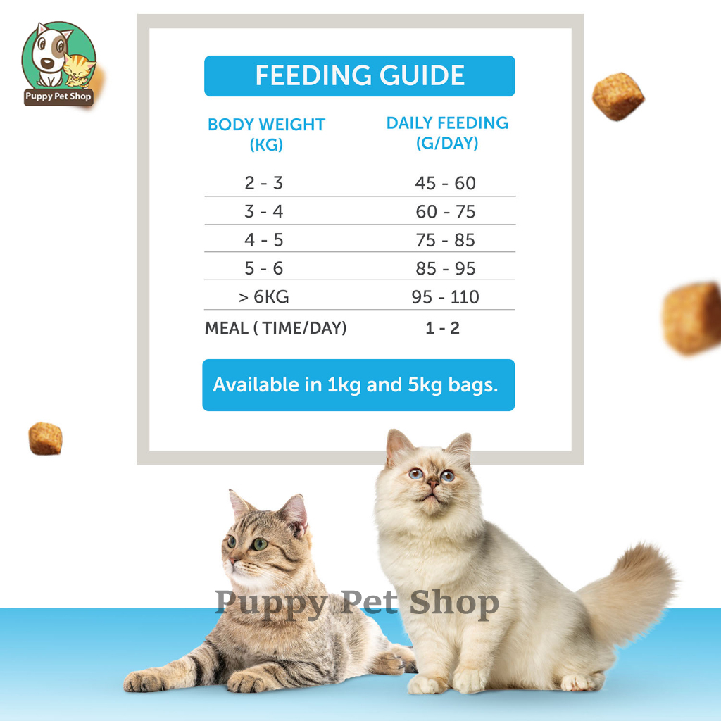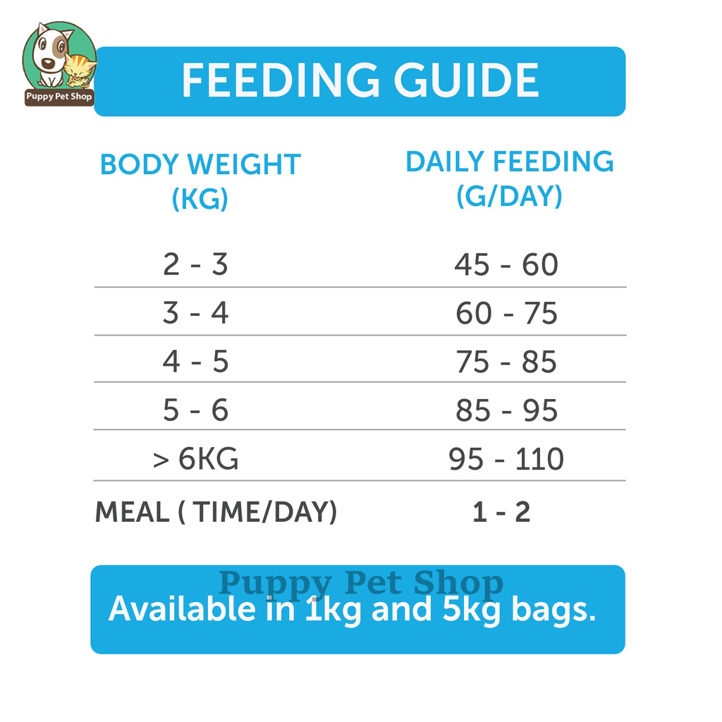 Thành phần: Thịt gia cầm bột, Gạo, Sản phẩm từ đậu nành, Chất béo gia cầm, Bã mỳ lúa mì, Lúa mì, Bột cá, Chất kích thích vị, Dầu cá (nguồn tự nhiên của EPS & DHA), Vitamin (Vitamin A, Vitamin D, Vitamin E, Vitamin K, Thiamine, Riboflavin, Pantothenic acid, Niacin, Pyridoxine, Folic acid, Vitamin B12 Choline), Khoáng chất (Canxi, Phốt pho, Kali, Natri Clorua, Magiê, Sắt, Đồng, Mangan, Kẽm, Iốt, Selen), Chất điều chỉnh axit, Clorua canxi, Prebiotics (Mannan oligosaccharides, Beta-glucans), Taurine, Arginine, Muối có iốt, Bột sữa, Chất chống nấm mốc, Chất chống oxy hóa, Chiết xuất yucca Schidigera.
