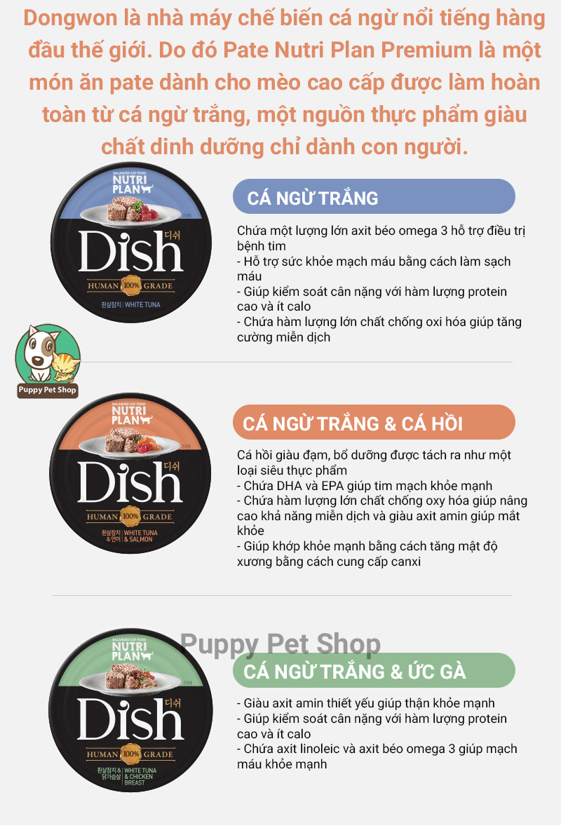 Chức năng: Là sản phẩm pate đóng hộp được Dongwon trực tiếp sản xuất nhằm đem lại giải pháp dinh dưỡng chuyên biệt và ưu việt cho sức khỏe của mèo.