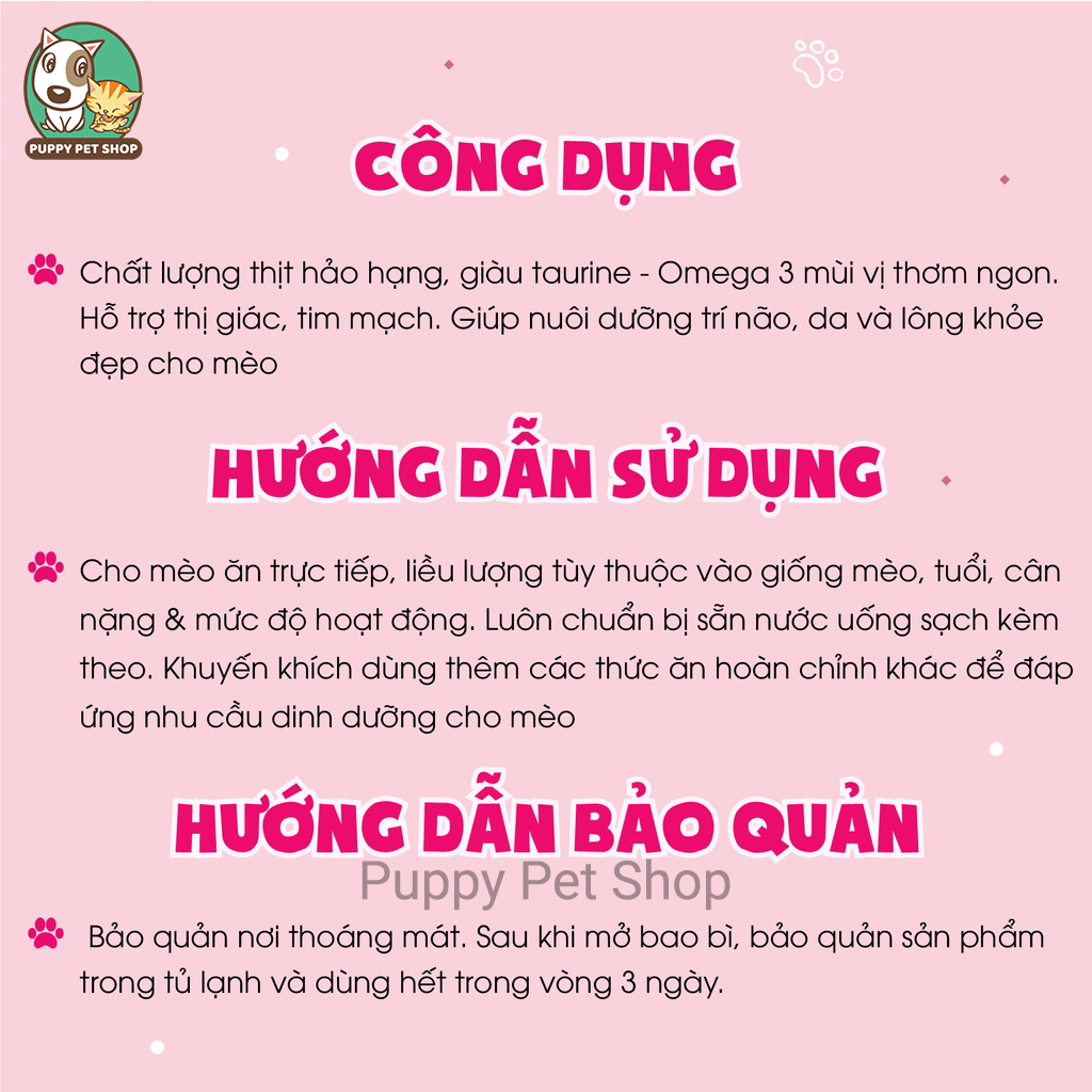 - Cho mèo ăn trực tiếp, liều lượng tùy thuộc vào giống mèo, tuổi, cân nặng & mức độ hoạt động. Luôn chuẩn bị sẵn nước uống sạch kèm theo. Khuyến khích dùng thêm các thức ăn hoàn chỉnh khác để đáp ứng nhu cầu dinh dưỡng cho mèo.