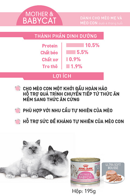 - Bằng cách sử dụng phác đồ dinh dưỡng khoa học Macro (Macro Nutrient Profile Science), Royal Canin Mother & Baby Cat được xây dựng dựa trên những sở thích bản năng của mèo con. Điều đó nghĩa là mèo con của bạn nhận được những gì yêu thích nhất và đầy đủ nhất ở mỗi bữa ăn