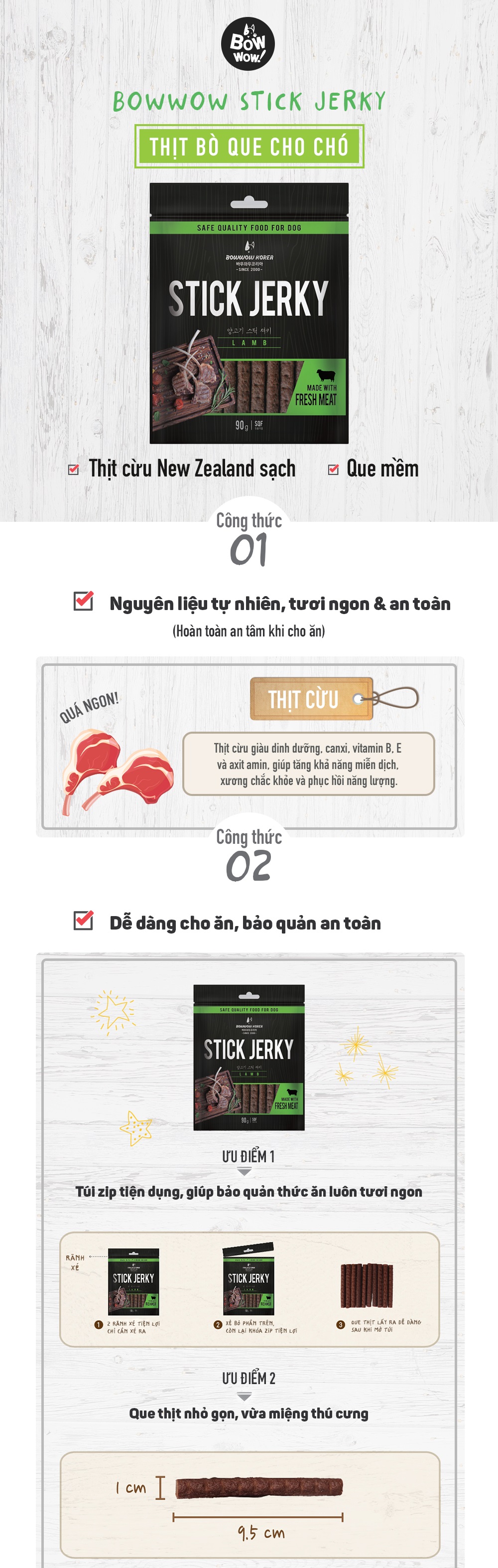Thịt cừu que cho chó Bowwow được làm từ thịt cừu tươi Úc, chứa hàm lượng protein cao, giúp làn da và bộ lông của chó khỏe mạnh, hỗ trợ hệ tiêu hóa và khả năng hấp thụ dưỡng chất.
