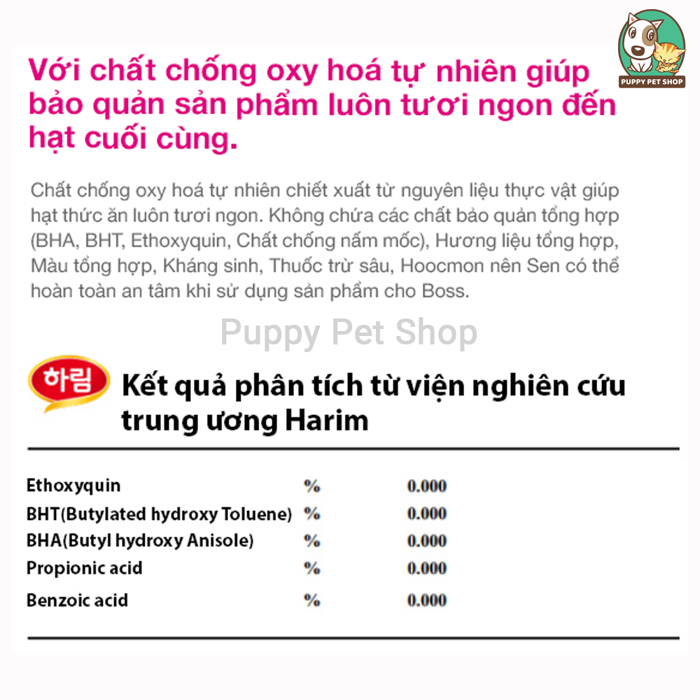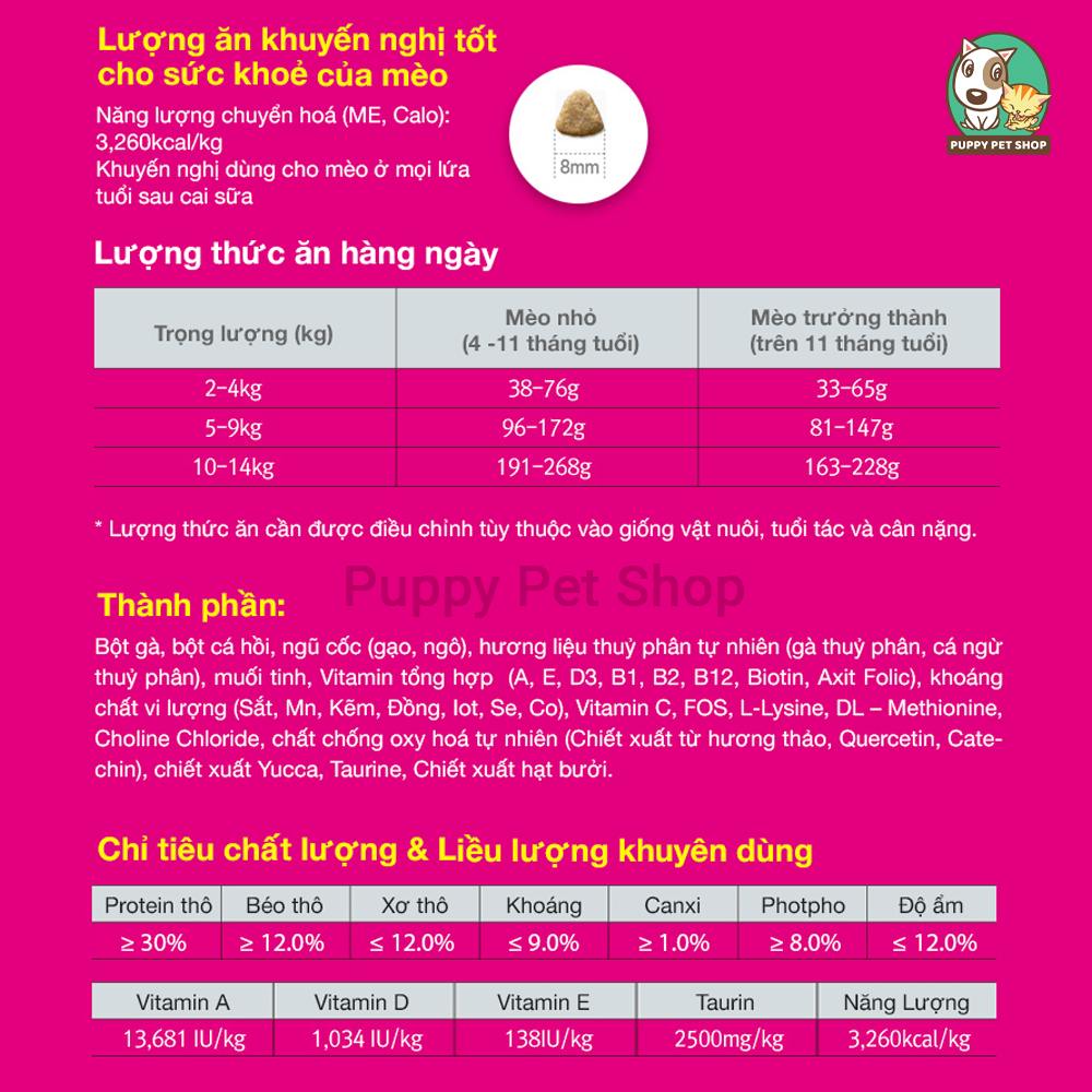 - Thành phần chính: Thịt gà cá hồi ngô gạo chất tạo mùi đường thực vật chất xơ taurine tinh chất cây yucca vitamin các khoáng chất khác.