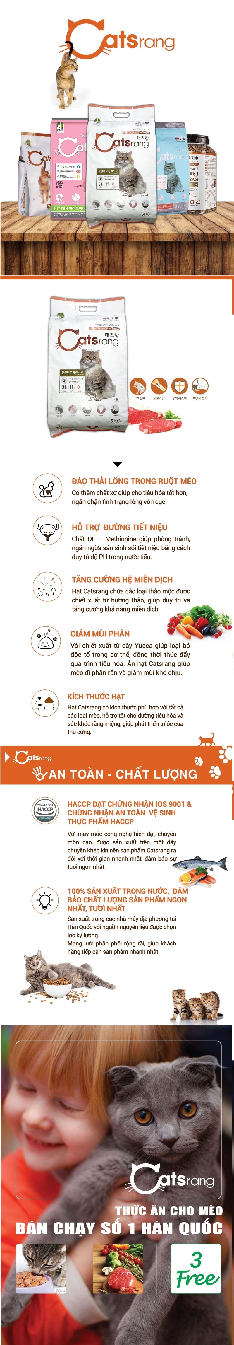 Là người yêu mèo, nuôi mèo chắc hẳn ai cũng mong muốn thú cưng của mình phát triển khỏe mạnh. Chính vì thế việc lựa chọn loại thức ăn hạt phù hợp rất quan trọng. Fusion Group xin giới thiệu tới quý khách sản phẩm thức ăn cho mèo cưng, phù hợp với túi tiền mà vẫn đảm bảo dinh dưỡng được nhập khẩu chính hãng từ Hàn Quốc - Catsrang