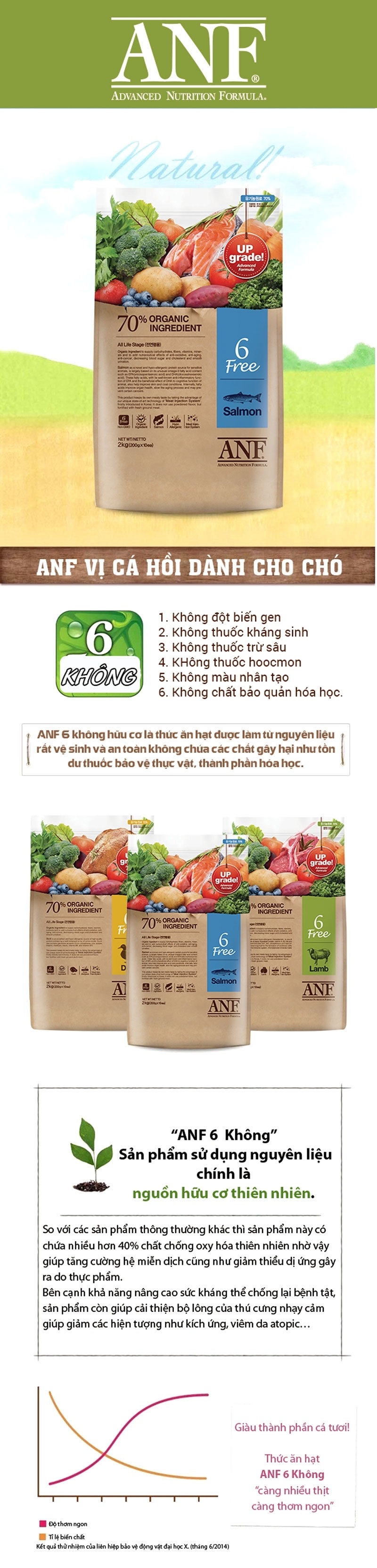 - Với thành phần lên tới 95% nguyên liệu hữu cơ, thức ăn hạt cho chó ANF vị cá hồi đảm bảo an toàn cho sức khỏe cũng như hệ thần kinh của chó.