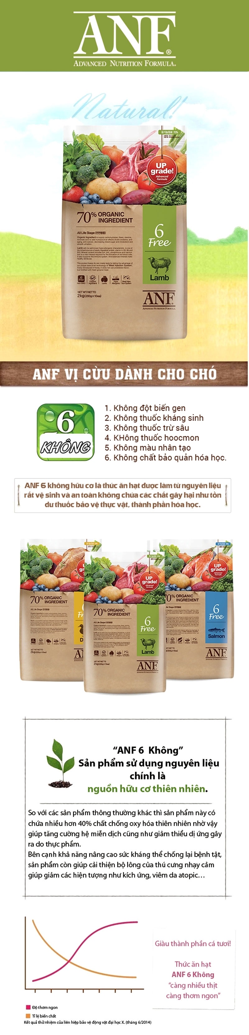 - ANF vị cừu là thức ăn hữu cơ nên sản phẩm tuyệt đối KHÔNG CHỨA kháng sinh, thuốc trừ sâu hay bất kỳ hoá chất độc hại nào, các nguyên liệu được nuôi trồng theo đúng tiêu chuẩn USDA an toàn cho sức khoẻ và đảm bảo giá trị dinh dưỡng, tạo cảm giác ngon miệng, hạnh phúc cho thú cưng của bạn mỗi khi ăn.