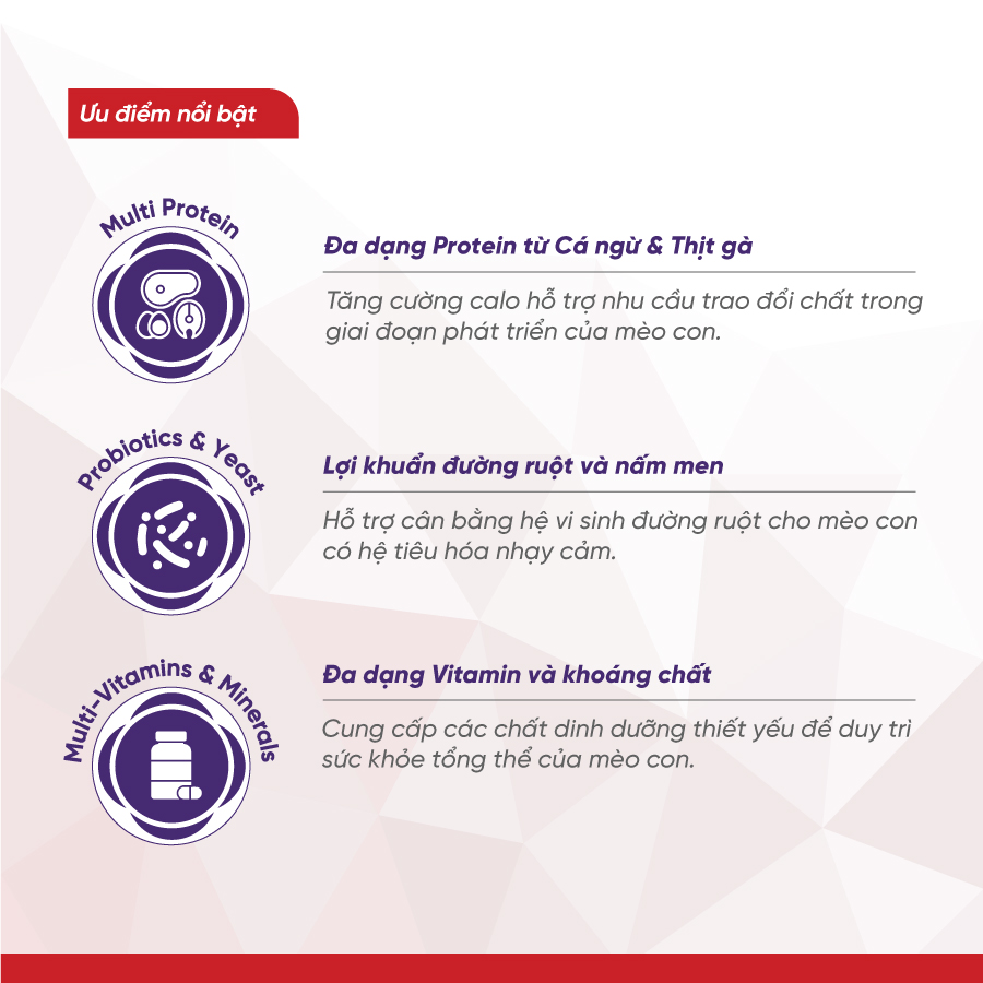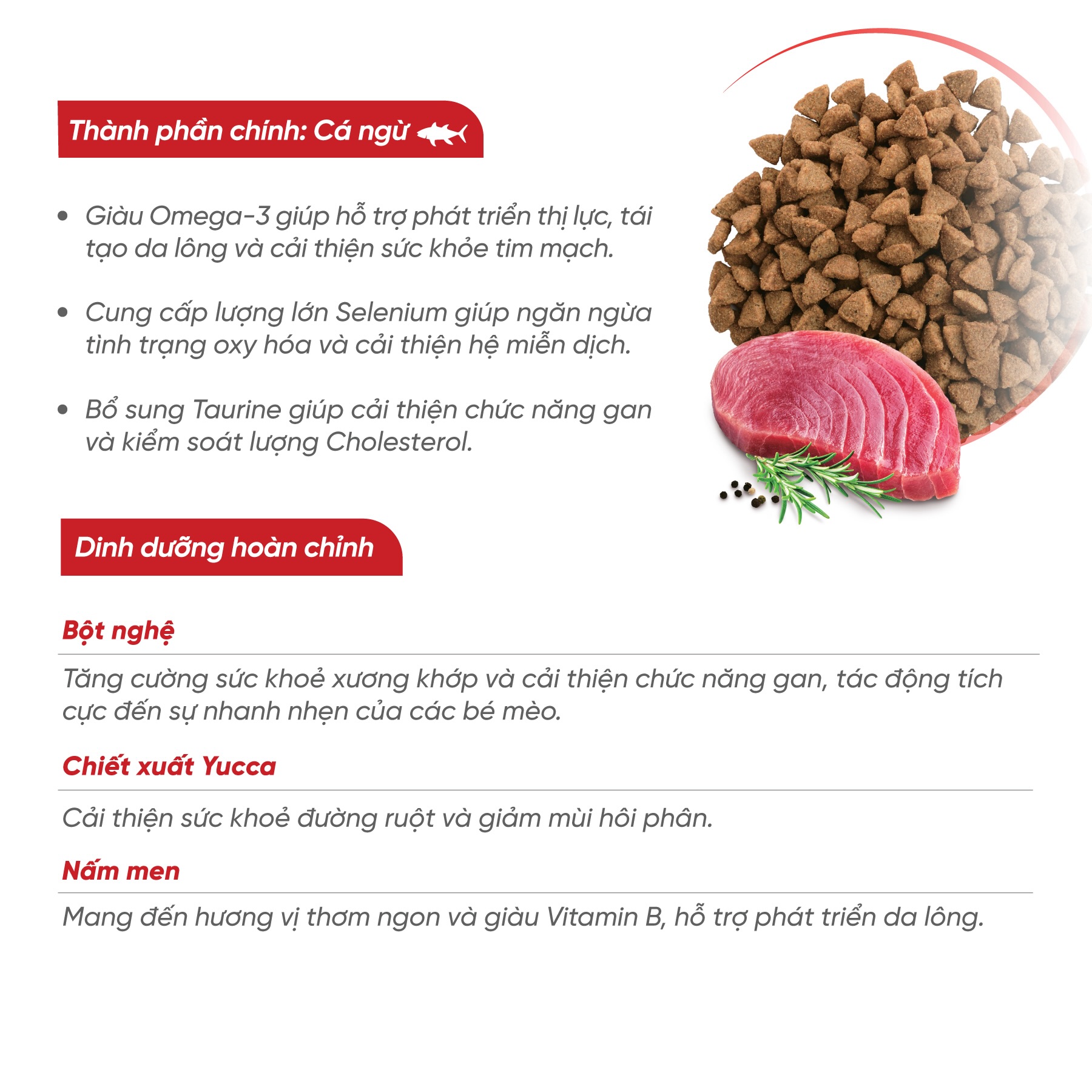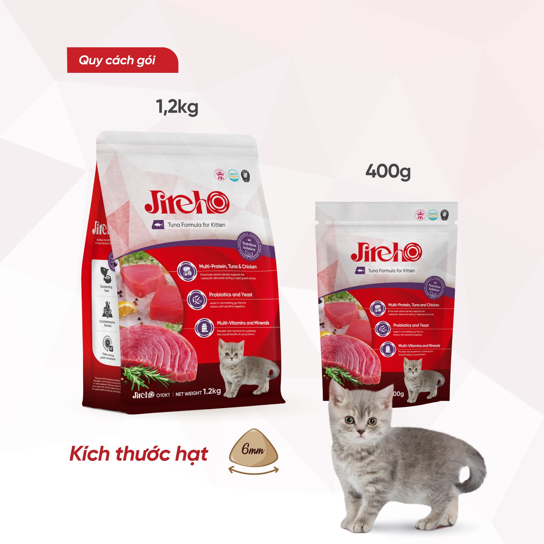 JirehO cá ngừ cho mèo con: Đa dạng Protein từ Cá ngừ và Thịt gà giúp tăng cường calo, hỗ trợ nhu cầu trao đổi chất trong giai đoạn phát triển của mèo con. Hỗ trợ cân bằng hệ vi sinh đường ruột cho mèo con có hệ tiêu hóa nhạy cảm. Đa dạng Vitamin và Khoáng chất cung cấp các chất dinh dưỡng thiết yếu để duy trì sức khỏe tổng thể của những bé mèo đang phát triển.
