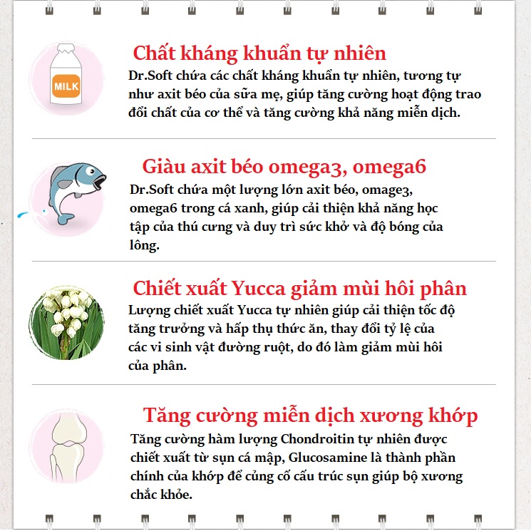 Bột thịt Cừu , bột đậu nành , lúa mì , bột ngô, bột gà, bột khoai tây, Dầu gà tinh chế , Glycerin , axit béo Omega 3 , - glucan , Fructooligosaccharide , Chlorella , bột trà xanh . bột quả việt quất , bột nam việt quất , chiết xuất YUCCA , Choline chloride , hỗn hợp mất amin , hỗn hợp vitamin, hỗn hợp khoáng chất ( canxi, photpho, kẽm...) , chất bảo quản , màu thực phẩm Chondroitin , Glucosamine