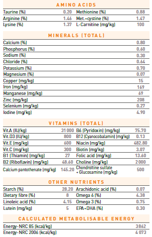 Bắp, mỡ gà, gluten lúa mì, bột gluten bắp, lúa mì, hương vị tự nhiên, dầu cá, aluminat silic natri, dầu thực vật, dầu ăn khô, monocalcium phosphate, canxi Carbonate, canxi sulfat, DL-methionine, clorua kali, vỏ hạt psyllium, muối, fructooligosaccharides, tripolyphosphate natri, menhydrolyzed, vitamin [DL-alpha tocopherol acetate (nguồn vitamin E), inositol, niacin bổ sung, L-ascorbyl-2 (Vitamin C), D-canxi pantothenate, biotin, pyridoxin hydrochloride (vitamin B6), riboflavin bổ sung, thiamine mononitrat (vitamin B1), vitamin A acetate, axit folic, bổ sung vitamin B12, vitamin D3 bổ sung], L - chất lysine, choline clorua, taurine, cystine, chiết xuất hoa cúc vạn thọ (Tagetes erecta L.), khoáng chất khoáng kẽm (protein kẽm, oxit kẽm, sắt sulfat, protein mangan, oxit mangan, đồng sulfat, canxi iodat, selenit natri, protein đồng Ăn, L-carnitine, chiết xuất từ hương thảo, bảo quản với tocopherols hỗn hợp và axit xitric…