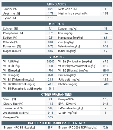 Bột mì, gluten lúa mì, chất béo gà, bắp, lúa mạch, bắp gluten bữa ăn, hương vị tự nhiên, ngũ cốc chưng cất men khô, lúa mì, thân vỏ lúa, sợi pea, dầu thực vật, bột củ cải khô khô, dầu cá, canxi sulfat, kali clorua , DL-methionine, vitamin [DL-alpha tocopherol acetate (nguồn vitamin E), inositol, niacin bổ sung, L-ascorbyl-2-polyphosphate (nguồn vitamin C), D-canxi pantothenate, biotin, pyridoxine hydrochloride (vitamin B6 ), Riboflavin bổ sung, thiamine mononitrat (vitamin B1), vitamin A acetate, axit folic, bổ sung vitamin B12, bổ sung vitamin D3], muối, clorua choline, taurine, cystine, khoáng chất khoáng chất [kẽm proteinate, oxit kẽm, ferrous sulfate, mangan Oxit, protein mangan, đồng sulfat, canxi iodat, selenit natri, đồng proteinat], chiết xuất hoa cúc (Tagetes erecta L.), L-tyrosine, chiết xuất từ hương thảo, bảo quản với tocopherols hỗn hợp và axit xitric.